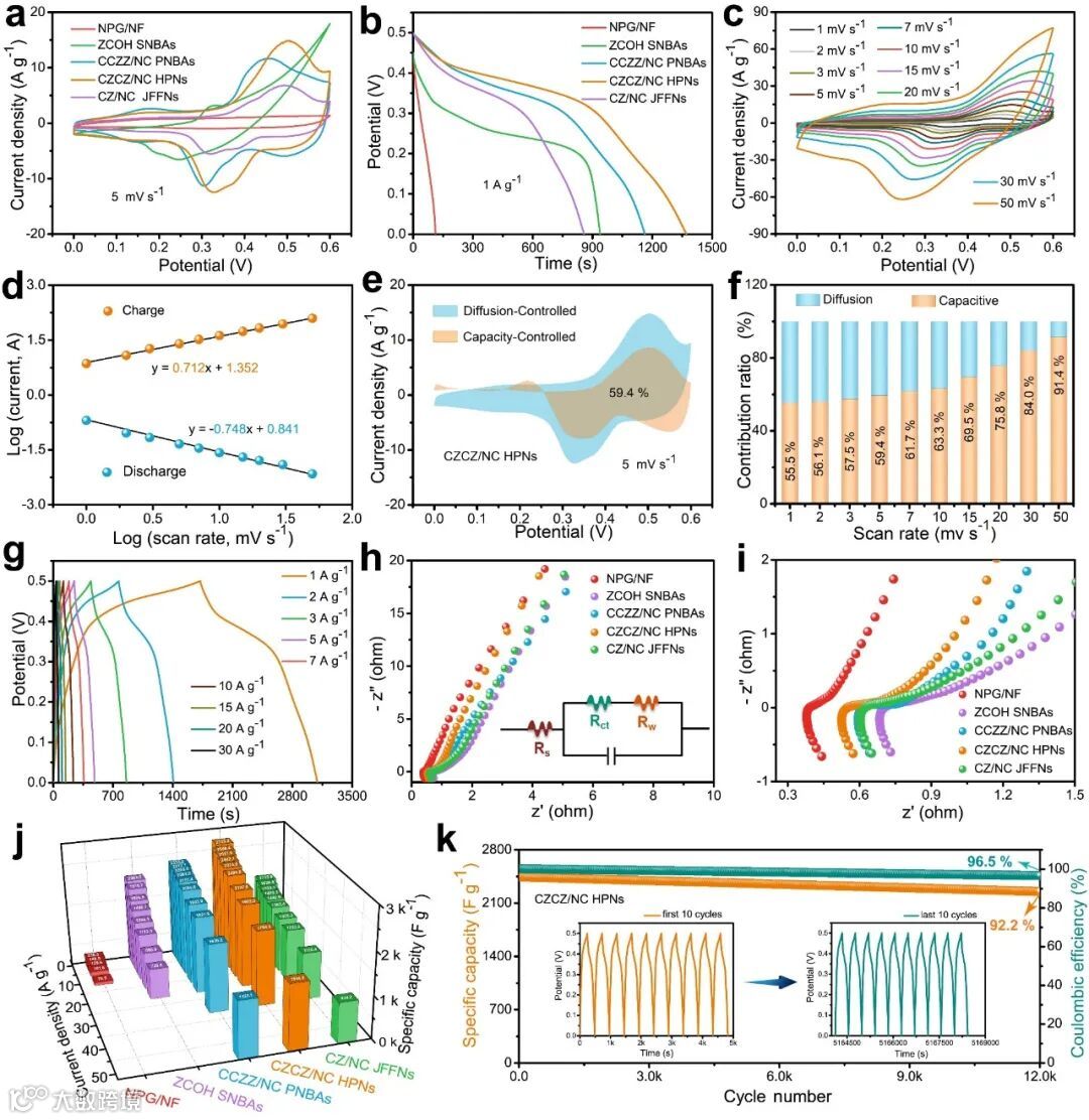 NPG/NF、ZCOH SNBAs、CCZZ/NC PNBAs、CZCZ/NC HPNs和CZ/NC JFFNs电极比较:(a) 5 mV s−1下的CV曲线,(b) 1 a g−1时的GCD曲线,(h, i)插入等效电路后的阻抗Nyquist图,(j)在不同电流密度下的比电容;CZCZ/NC HPNs 电极:(c)不同扫描速率下的CV曲线,(d) log (i)与log (v)的对比图,(e) 5 mV s−1电容行为和扩散行为的比例,(f) 不同扫描速率下电容行为和扩散行为的比例图,(g)不同电流密度下的GCD曲线,(k)在5 A g−1下12000次循环的循环稳定性测试图。