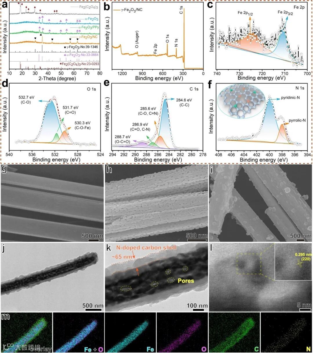 (a) Fe2(C2O4)3、α-Fe2O3、α-Fe2O3/PPy和γ-Fe2O3/NC的XRD谱图;γ-Fe2O3/NC的XPS分析:(b) 全谱,(c) Fe 2p,(d) O 1s,(e) c 1s和(f) N 1s的高分辨率光谱;(g) Fe2(C2O4)3,(h) α-Fe2O3,(i) γ-Fe2O3/NC的FE-SEM图像;(j, k) STEM图像,(l) HADDF-STEM图像,(m) γ-Fe2O3/NC的STEM元素映射。