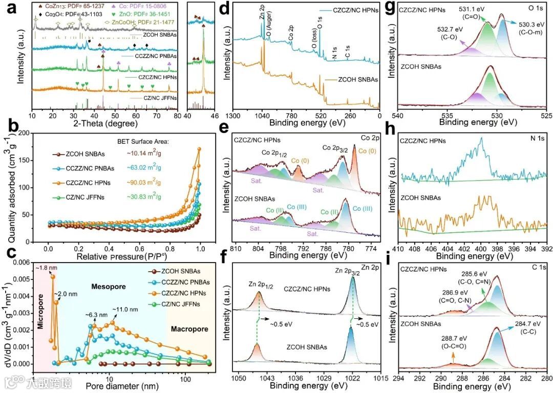 ZCOH SNBAs、CCZZ/NC PNBAs、CZCZ/NC HPNs和CZ/NC JFFNs粉末:(a) XRD谱图,(b)加入BET表面积后的氮气吸附-解吸等温线,以及(c)孔径分布图;ZCOH SNBAs和CZCZ/NC HPNs的XPS分析:(d) 全谱,(e) Co 2p,(f) Zn 2p, (g) O 1s,(h) N 1s和(i) C 1s高分辨光谱。
