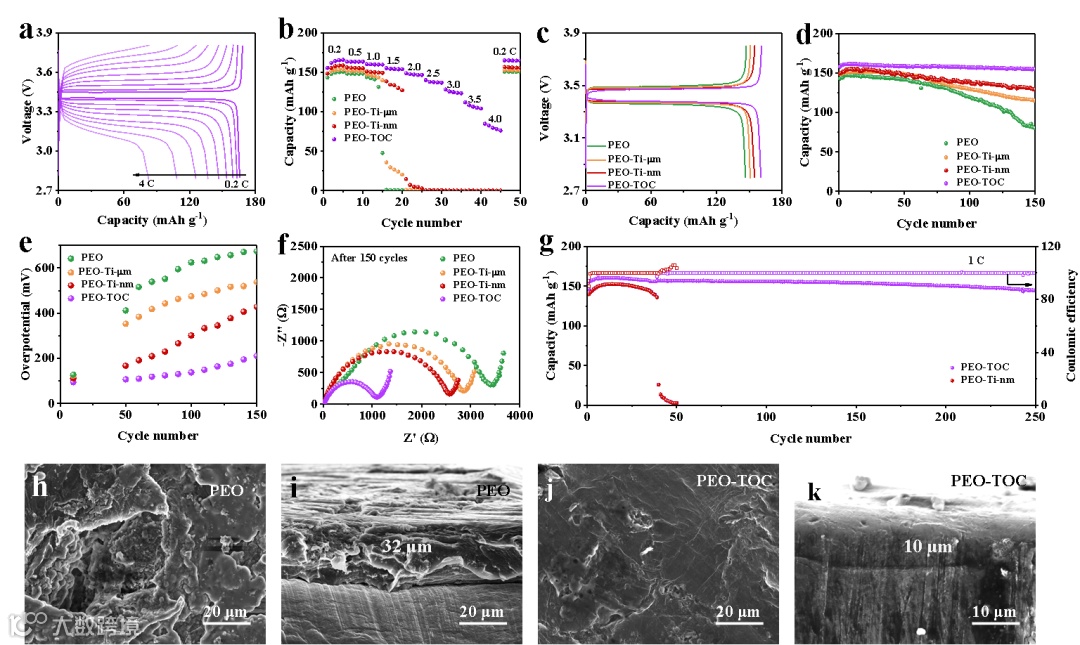 离子整流电解质膜极大的提高了电池的倍率性能和循环性能。由于其均匀膜结构,高的机械强度,高的锂离子电导率和离子迁移数,所组装的磷酸铁锂电池在3.5 C条件下容量仍有 111.9 mAh g-1,这是其它固态电解质膜无法实现的。离子整流效果在锂离子均匀沉积方面得到了有效验证。电池经过150次循环后,使用PEO-TOC膜的锂负极表面无明显地锂枝晶被观察到,断面图可以看出锂离子均匀沉积。