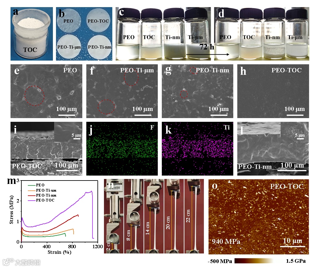 TOC具有直径为2.69nm、高度为1.04nm的轮胎状骨架和刷状PEG链。其纳米结构可以有效抑制PEO结晶,PEG和PEO具有相似结构,可以有效阻止TOC团聚。因此TOC被定义为尺寸匹配、亲和力匹配,双匹配功能填料。TOC和PEO-LiTFSI复合后即为离子整流聚合物电解质膜(PEO-TOC)。和传统TiO2填料,即非双匹配填料相比,使用TOC填料的铸膜液和电解质膜具有更均匀的结构,这有利于锂离子在膜中连续且均匀传递。同时和PEO电解质膜相比机械性能得到大幅提高:屈服强度提高2.4倍,AFM测试杨氏模量提高了2.7倍。