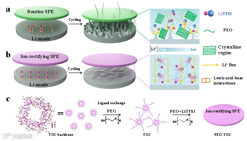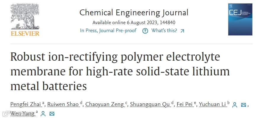 近日,来自北京理工大学材料学院李玉川和化学与化工学院杨文长聘副教授,在国际知名期刊Chemical Engineering Journal上发表题为“Robust ion-rectifying polymer electrolyte membrane for high-rate solid-state lithium metal batteries”的研究论文。该论文提出通过亲和力匹配和尺寸匹配的钛氧簇为功能填料,复合PEO基电解质,制备出离子整流聚合物电解质膜。钛氧簇均匀分散在PEO基固态电解质中,有效抑制PEO结晶,形成均匀连续的锂离子传递通道,锚定TFSI-阴离子,实现锂离子整流效果,同时显著提高了PEO基固态电解质的机械强度,抑制了锂枝晶生长。