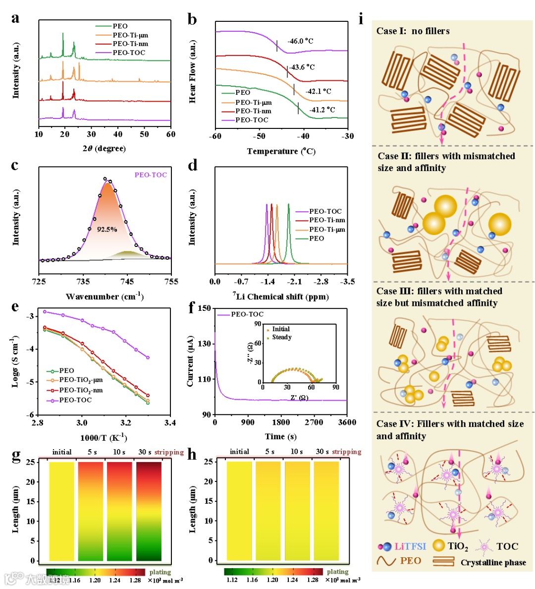 TOC均匀分散在PEO基电解质中得到的离子整流聚合物电解质膜。在PEO-TOC中,TOC有效的抑制了PEO的结晶,DSC显示PEO-TOC电解质膜的玻璃化转变温度显著降低,说明PEO链运动性增强有利于提高锂离子电导率。TOC中Leiws酸性Ti-O官能团有效锚定TFSI-离子提高了锂离子迁移数。因此,在30 条件下锂离子电导率在提高了一个数量级为5.5 × 10-5 S cm-1,在 60 条件下锂离子迁移数为0.51,远高于PEO基电解质膜。通过Comsol模拟可知,高的电导率和迁移数,使得锂离子在锂表面有更小的浓差极化。