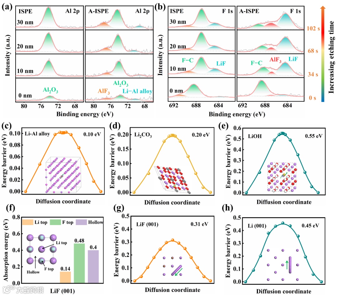 路易斯酸供氟添加剂AlF3能够参与构建稳定的锂金属电极/电解质界面,是通过在锂金属界面处原位引入功能性SEI成分,包括富LiF,具有高度亲锂性的Li-Al合金以及能够降低Li+成核过电位的AlF3。富LiF成分能够有效保护锂金属负极界面,同时通过对SEI成分的锂离子扩散能垒的计算,发现相比于传统的SEI成分(Li2CO3、LiOH),Li-Al合金具有极低的体相锂离子扩散能垒。SEI成分低的扩散能垒能够实现锂金属界面处快速的锂离子迁移动力学,进而实现锂金属电池长的循环寿命和优异的倍率性能。