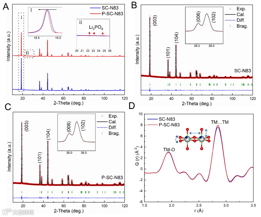 Figure 2. Crystal structures of the SC-N83 and P-SC-N83 samples. Comparison of XRD patterns of (A) SC-N83 and P-SC-N83 samples. The insert I shows the left shift of (003) peak and the insert II shows the formation of Li3PO4. Rietveld refinement patterns of (B) SC-N83 and (C) P-SC-N83 powders. The insets show the well-split (006) and (102) Bragg peaks. (D) Low-r PDF pattern corresponding to the first two-shell atom pairs.