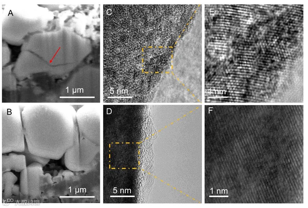 Figure 6. Overall morphology and structural evolution of the SC-N83 and P-SC-N83 samples after 100 cycles. cross-sectional SEM image of (A) SC-N83 and (B) P-SC-N83. The insert red arrow shows internal crack of SC-N83 after cycling. HR-TEM images of (C) SC-N83 and (D) P-SC-N83 after cycling, and their corresponding enlarged images (E) and (F).