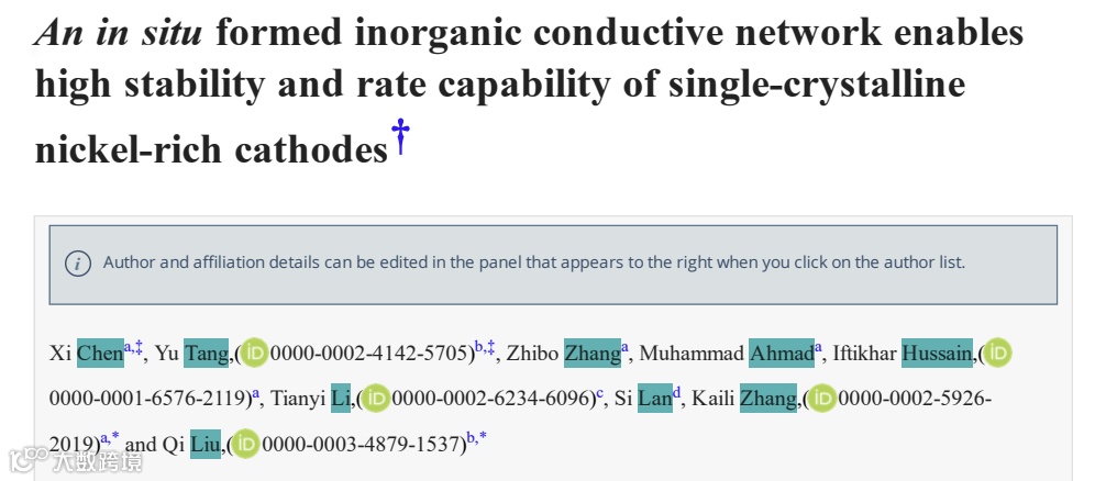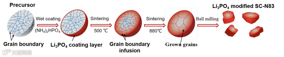 全球减排CO2推动绿色电动车需求增加,使高能量密度锂离子电池(LIBs)需求上升。层状高镍LiNixCoyMnzO2(NCM, x≥0.6, x+y+z=1)正极材料由于其极高的能量密度作为LIBs正极材料备受关注。然而,当Ni含量超过80%时,NCM存在结构不稳定性。在深度充电时,其在c轴方向产生的巨大晶格收缩会导致微裂纹的产生,从而导致一系列结构以及表面的退化,从而影响材料循环稳定性。为解决这一问题,目前工业上主要采用的方法是掺杂,包覆以及单晶化等方法。考虑到NCM颗粒单晶化可以提高材料循环稳定性,提高压实密度并且减少产气等优势。但单晶NCM正极材料存在动力学限制,通过构建表面涂层的方法可以提高锂离子动力学,而表常规面涂层的构建不易实现100%包覆。