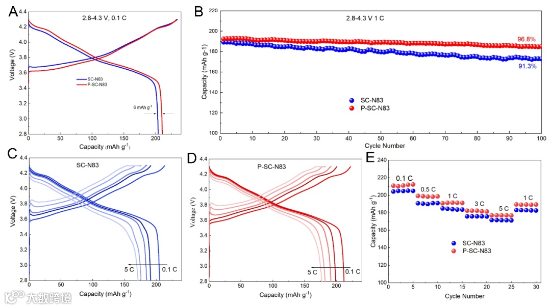 Figure 4. Electrochemical performance of SC-N83 and P-SC-N83 samples. (A) Initial charge/discharge profile of SC-N83 and P-SC-N83 at 0.1 C. (B) Cycling performance of SC-N83 and P-SC-N83 at 0.1 C. Charge/discharge profiles of (C) SC-N83 and (D) P-SC-N83 at different current densities. (E) Rate capabilities of SC-N83 and P-SC-N83.