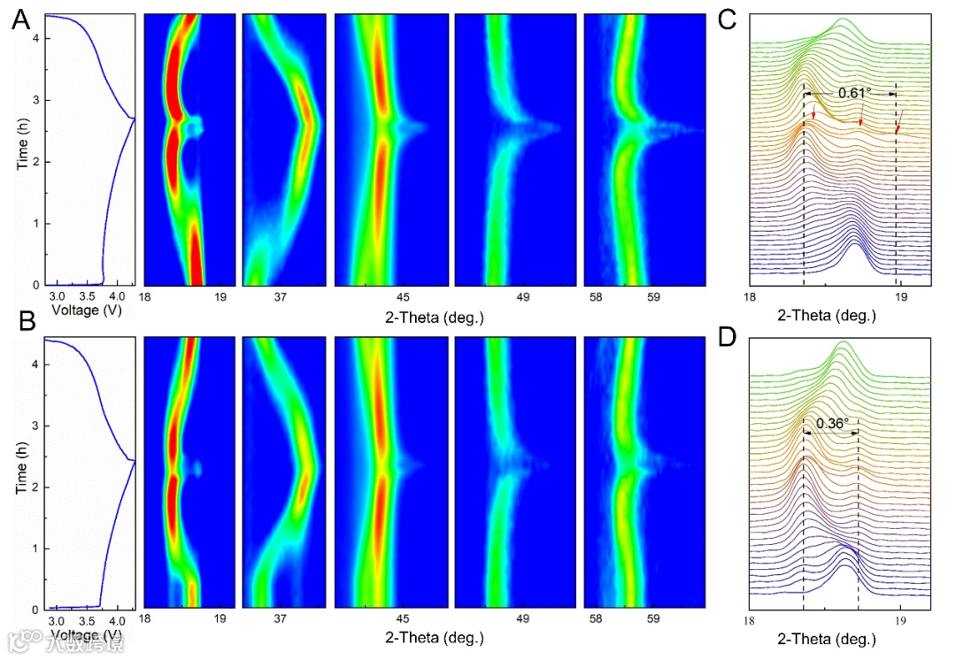 Figure 5. In situ XRD of SC-N83 and P-SC-N83. Contour plots of in situ XRD patterns of (A) SC-N83 and (B) P-SC-N83 cathodes at the current of 1/3 C. Stack profiles of enlarged (003) peak for (C) SC-N83 and (D) P-SC-N83.