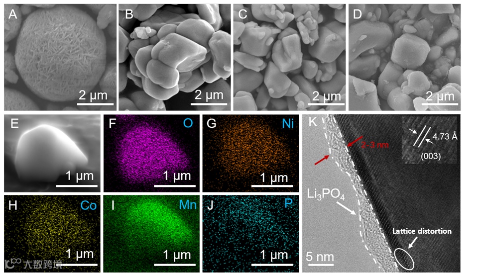 Figure 3. Overall morphology and elemental mapping of the SC-N83 and P-SC-N83 samples. SEM image of (A) precursor, (B) after first sintering, (C) SC-N83 and (D) P-SC-N83 after second sintering. (E-J) Cross-sectional image and elemental mapping. P element mainly enrich on the surface of the particle. (K) HR-TEM image of P-SC-N83 sample. The insert shows the (003) plane and the marked shows the uniform coating of Li3PO4.