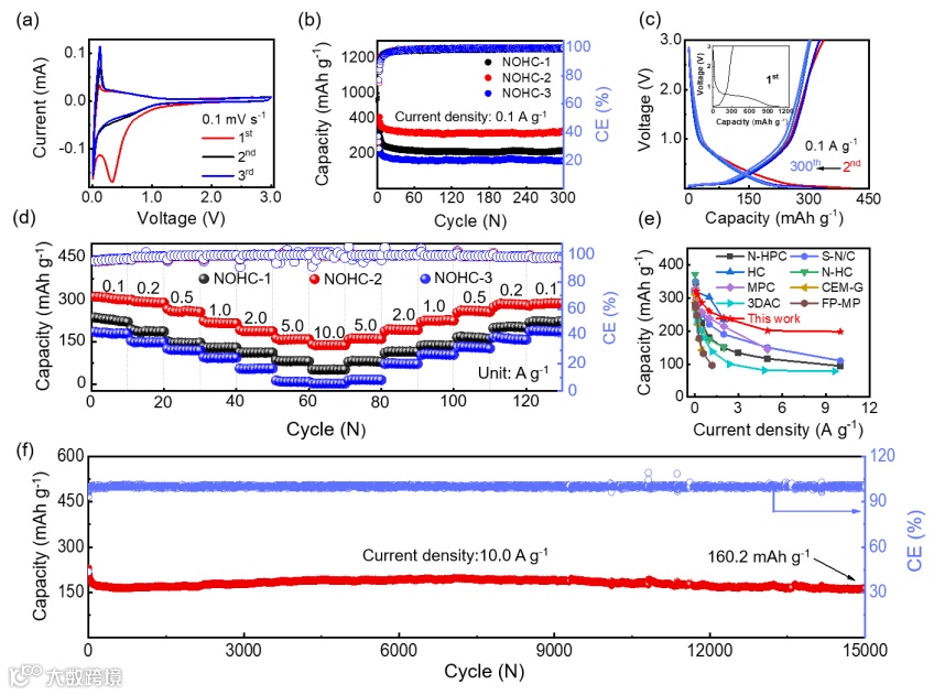 NOHC-2||Na半电池在0.01-3.0 V电压范围内,可达到324.3 mAh g-1(0.1 A g-1)的超高比容量,在10 A g-1时仍保持160.2 mAh g-1的出色倍率性能,循环15000次后容量保持率约为70%。值得注意的是NOHC-2平台区域的贡献容量占比高达40 %,在大倍率电流密度下容量衰减得到了一定的抑制。同时,杂原子的引入对NOHC-2结构的改善、微孔的调节和层间距的增加起到的重要的作用,所以其在斜坡区和平台区均保持了较高的容量。