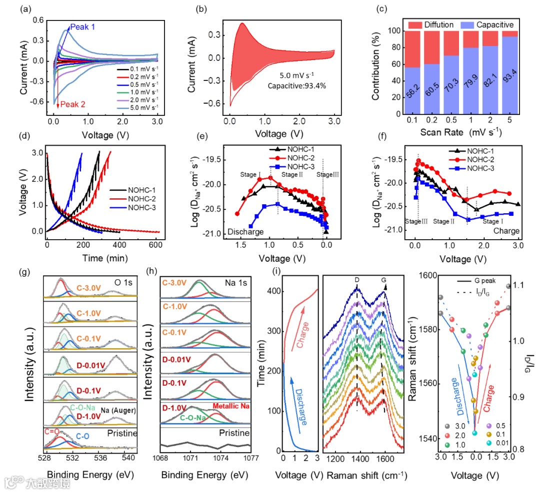 为了进一步研究钠离子在所制备硬碳电极材料中的电化学动力学行为,作者利用恒电流间歇滴定测试(GITT)和变扫CV进行了钠离子扩散系数的计算。由计算可知,NOHC-2电极作为钠离子电池负极展现出了更好的离子扩散特性,这也可以进一步解释其具有优异倍率性能的原因。同时GITT测试也表明了硬碳在平台区和斜坡区的离子扩散系数存在明显差异,也间接说明在不同充放电阶段硬碳的储钠机制是有所不同的。此外,通过非原位的XPS分析结果发现,C=O通过与Na+形成C-O-Na化合物来增加NOHC-2电极的可逆容量,证明氧掺杂对储钠性能有积极的促进作用。