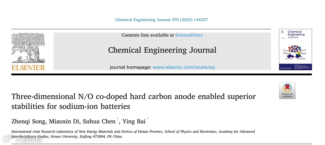 Zhenqi Song, Miaoxin Di, Suhua Chen*, Ying Bai*, Three-dimensional N/O co-doped hard carbon anode enabled superior stabilities for sodium-ion batteries, https://www.sciencedirect.com/science/article/pii/S1385894723029686?dgcid