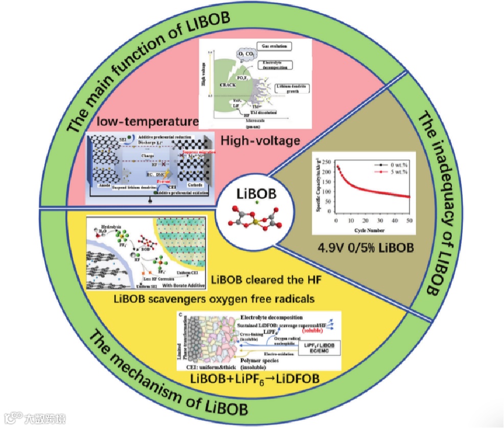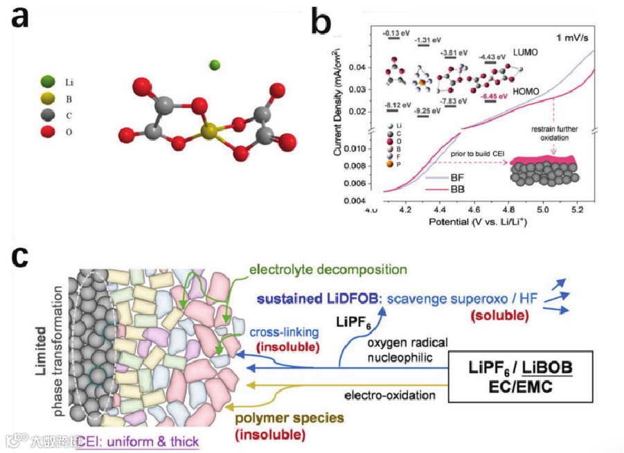 Zhao等人的研究表明,含LiBOB的电解质不仅有利于在阳极表面形成致密的固体电解质界面相,而且还能形成稳定的CEI层,有效防止阴极界面的腐蚀,显著提高电池的长期循环性能。对这些过程的深入了解为后续的研究和未来的应用提供了有用的见解。
