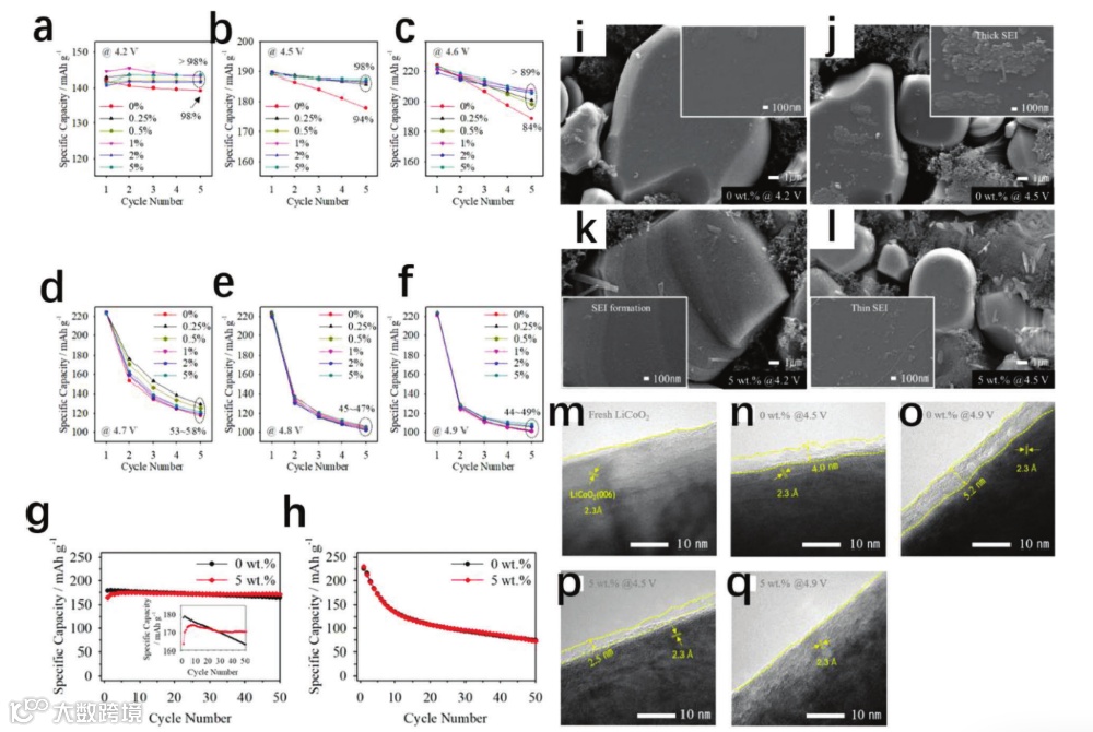 图6. 在a) 4.2 V, b) 4.5 V, c) 4.6 V, d) 4.7 V, e) 4.8 V, f) 4.9 V的不同电压条件下,对不同浓度的双(草酸)二硼酸锂(LiBOB)进行5次循环的放电容量。i) 0 wt%和j) 5 wt% LiBOB分别在4.2和4.5 V下循环,和k) 0 wt%和l) 5 wt% LiBOB分别在4.5 V下循环。分别在m)新鲜LCO粉末,n) 4.5和4.9 V切割电压下循环电极颗粒中LiBOB含量为0 wt%, p) 4.5 V和q) 4.9 V切割电压下循环电极颗粒中LiBOB含量为5 wt%。