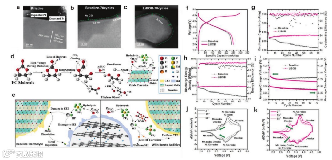 图4. 低温扫描电子显微镜对不同状态下的富锂层状氧化物(LRLO)阴极样品的表面和/或阴极电解质界面(CEI)区域进行了扫描。a)原始状态,b)在基线电解质中循环,c)在双(草酸)硼酸锂(LiBOB)电解质中循环。d)碳酸盐基电解质在高压层状氧化物体系中的分解机理示意图。e)高电压全电池系统中硼酸添加剂电解质电池性能增强的机理。LRLO-UM/石墨全电池在基线电解质和LiBOB电解质中的电化学性能f)第一次循环电压分布,g)循环放电容量和CE, h)循环放电能量密度和EE, i)循环平均充放电电压,j)基线电解液中电池循环的dQ/dV分析,k)LiBOB电解液中电池循环的dQ/dV分析。所有电池均为3 mAh cm-2级LRLO-UM/石墨全电池,第一个周期为2 - 4.7 V, C/20,其余周期为2 - 4.55 V, C/10 (1 C = 270 mAg-1)。