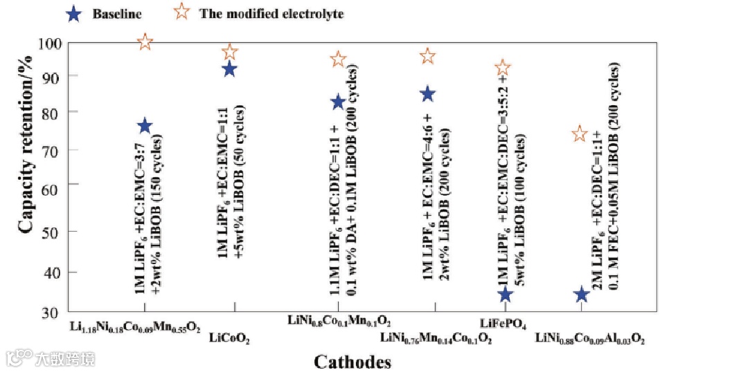 LiBOB具有优良的成膜性能,适用于普通高压电解质和高压材料。将LiBOB应用于高压尖晶石LiNi0.5Mn1.5O4阴极,形成了富有机SEI层,抑制了镍和锰的溶解,并通过电解液的氧化分解改善了其电化学性能将LiBOB应用于高容量富镍层状氧化物阴极LiNi0.8Co0.1Mn0.1O2(富镍NCM),LiBOB形成的无机富B和富O界面层提供了快速的Li+扩散通道,保证了富镍NCM的高多重性能。将LiBOB应用于富含锂的层状氧化物,可以形成富B和富o的无机边界面膜,增强界面的稳定性,以及与自由基反应的能力,大大减少了气体的生成,使循环更加稳定。