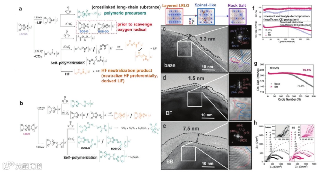 LiDFOB在电解液中由LiBOB和LiPF6产生,可以清除氧自由基,从而防止氧气和二氧化碳等气体的产生。或者,LiDFOB可以直接加入电解质中,有效地去除亲核物质及其寄生反应(如图5a所示)。然而,LiDFOB的分解产物是可溶的含硼低聚物,对进一步形成CEI无用。较薄的CEI在循环过程中不能有效保护电极材料,导致阴极分解变形对于LiBOB,它可以像LiDFOB一样,深度清除氧自由基。另一方面,LiBOB的独特优势在于,分解产物是不溶性的含硼聚合物,这反过来可以形成图4j,k, 5b.中均匀的厚CEI这些CEI膜尽量避免电解液与LRLO直接接触,防止了副反应的发生。同时,薄膜是含有B或F的有机聚合物,有利于锂离子的高效转移,提高正极材料的电化学稳定性(如图4f-i所示)。含有LiBOB的电解液也具有较低的阻抗,从图5h的电化学阻抗图可以看出。图4a-c, 5c-e中电解质膜的厚度也会影响lib的性能。LiBOB形成的膜是最厚的(图5c-e),因此在长时间的循环过程中更有可能保持稳定(图5f,g)。