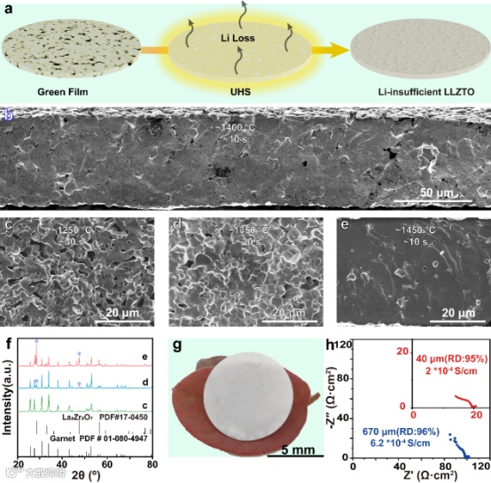 图 3.LLZTO 薄膜的快速烧结。a) UHS 烧结 LLZTO 薄膜的示意图b) UHS 烧结的致密 LLZTO 薄膜横截面形貌。c 至 f) 不同温度和时间烧结的 LLZTO 薄膜的横截面形貌以及相应的 XRD 图样。g) 平面烧结的 LLZTO 薄膜照片。h) Li/ LLZTO 薄膜/锂对称电池和 Li/ LLZTO 块体/锂对称电池的电化学阻抗谱(EIS)。
