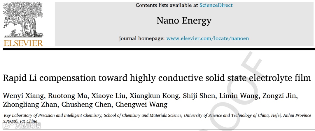 近日,中国科学技术大学王成威教授团队开发了一种快速锂补偿(RLC)技术,该技术结合超快速高温烧结(UHS)技术和流延工艺生产出高离子导电性的平整石榴石型 SSE 薄膜。采用该技术制造的自支撑Li6.4La3Zr1.4Ta0.6O12(LLZTO)薄膜厚度为40μm,表面粗糙度为5μm,相对密度为95%。实验结果表明,在经过 10 秒钟的锂补偿后,失锂产物La2Zr2O7明显减少,补偿后的 LLZTO 薄膜显示出 4.3 × 10-4 S/cm 的离子导电率,是未补偿薄膜的 2 倍。作为概念验证,这种 RLC 技术为高性能陶瓷薄膜的制造提出了一种新策略,同时也为 ASSB 的应用奠定了坚实的基础。该文章发表在Nano Energy上。博士生向文艺为本文第一作者。