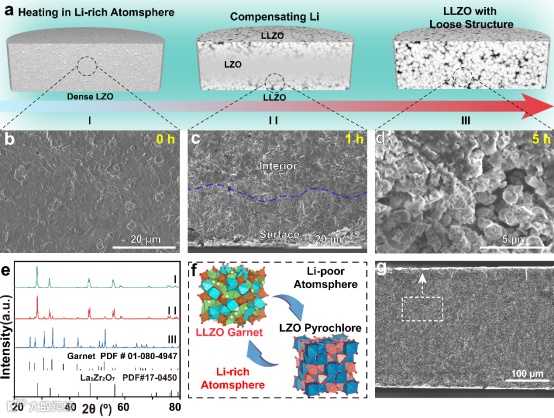 图 4.a) La2Zr2O7 样品在熔炉中加热进行锂补偿的示意图。b-e) La2Zr2O7 样品在熔融 LiOH 中加热不同时间后的横截面形貌和相应的 XRD 图。f) LZO 和 LLZO 之间的转化示意图。
