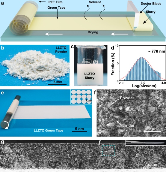 图2 流延法制备LLZTO绿带。a)流延工艺示意图。b)球磨后的LLZTO粉末图像。c)将LLZTO粉末和PVB分散在乙醇中制备浆料。d) LLZTO粉末粒度分布统计。e) LLZTO膜图像。f、g)不同放大倍数下LLZTO生坯的横截面形貌。