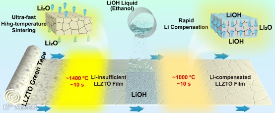 图 1 超快烧结和快速锂补偿以获得高 Li+ 导电 LLZTO SSE 薄膜的示意图。