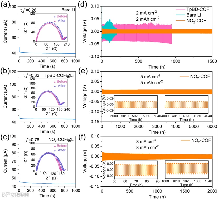 Figure 3. a-c) The Li+ transfer number of Bare Li, TpBD-COF/Li and NO2-COF/Li modified batteries. d-f) Galvanostatic cycling of Li-Li symmetric cells at current density of 2 mA cm-2, 5 mA cm-2 and 8 mA cm-2.