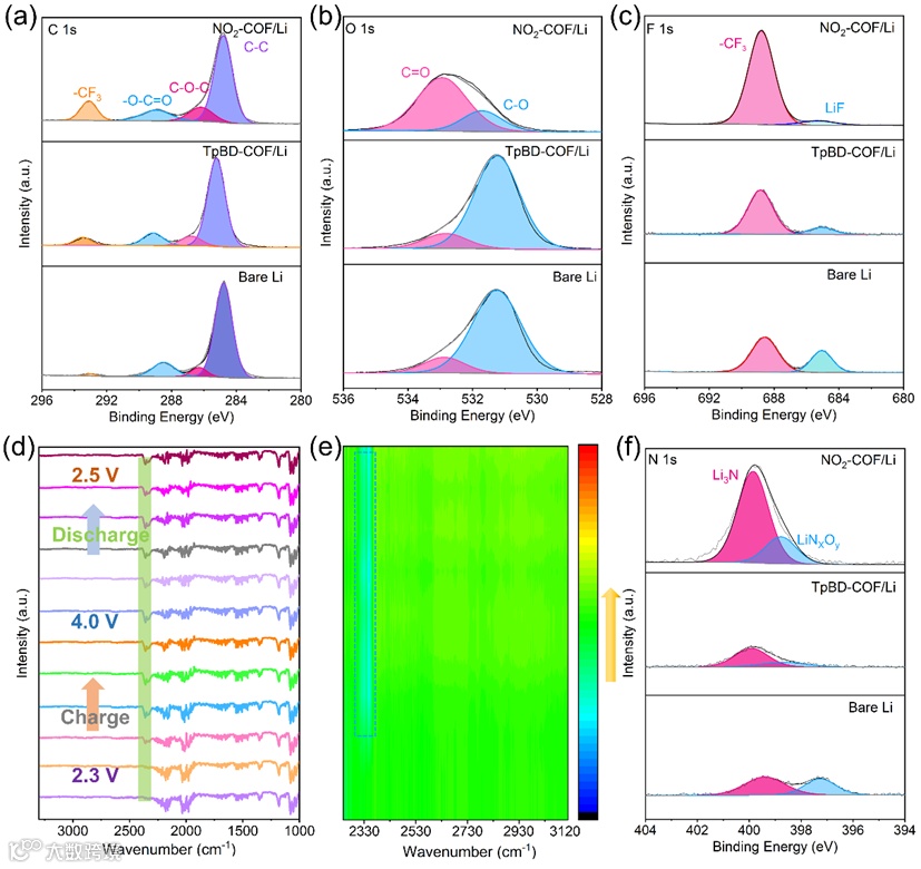 Figure 4. a-c) XPS spectra of C 1s, O 1s and F 1s for bare Li, TpBD-COF/Li and NO2-COF/Li electrodes after 100 hours in Li-Li symmetric batteries at 2 mA cm-2 with a capacity of 2 mAh cm-2. d) The in-situ FTIR spectra of NO2-COF modified batteries during the process of charge and discharge. e) Contour maps of the in-situ FTIR at different discharge and charge steps. f) XPS spectra of N 1s for bare Li, TpBD-COF/Li and NO2-COF/Li electrodes after 100 hours in Li-Li symmetric batteries at 2 mA cm-2 with a capacity of 2 mAh cm-2.