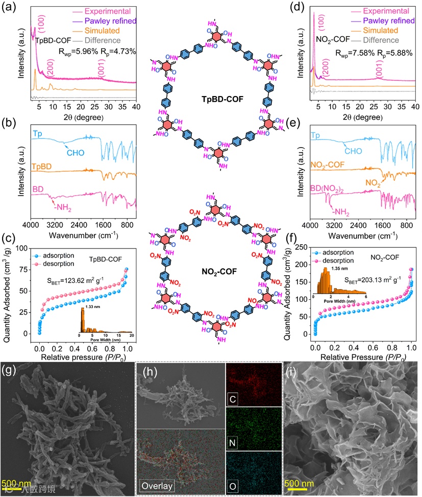 Figure 2. a-c) The PXRD patterns, FTIR spectra, N2 adsorption-desorption isotherms and pore size distribution patterns of TpBD-COF. d-f) The PXRD patterns, FTIR spectra, N2 adsorption-desorption isotherms and pore size distribution patterns of NO2-COF. g, h) The SEM images and EDS mapping of NO2-COF. i) The SEM images of TpBD-COF.