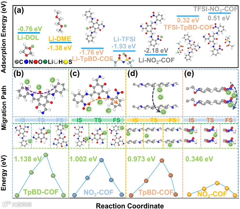 Figure 7. a) The chemical coordination circumstance of simulated affinity energy between COFs (TpBD-COF, NO2-COF) fragment and LiTFSI based electrolyte with the terminal optimized geometries. b-e) Theoretical elucidation of Li-ion migration behaviors inside the COF (top) with corresponding energy diagrams (bottom). The initial, transition, and final states are abbreviated as IS, TS, and FS, respectively.