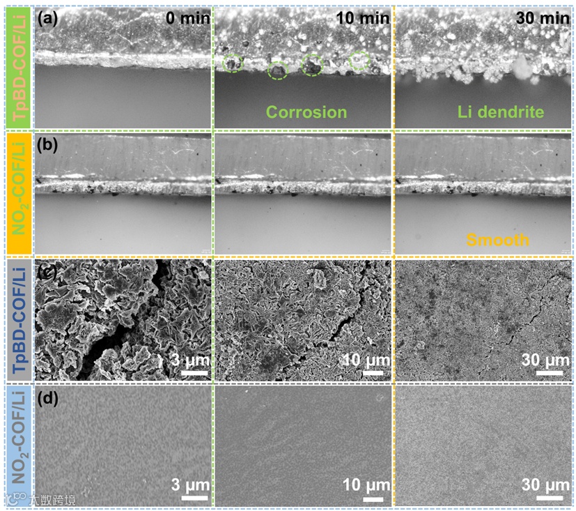 Figure 5. a, b) In situ optical microscopy observations of the Li deposition process on TpBD-COF/Li and NO2-COF/Li at the current density of 2 mA cm-2. c, d) SEM image of surface morphology for TpBD-COF/Li and NO2-COF/Li electrodes after 100 cycles at 2 mA cm-2 with a capacity of 2 mAh cm-2.