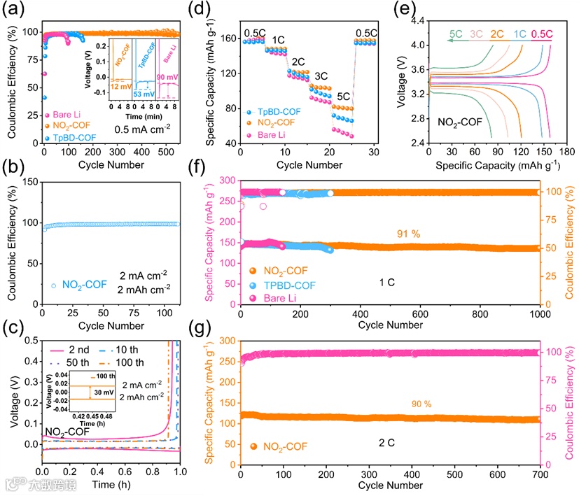 Figure 6. a-c) Coulombic efficiency and Li nucleation overpotentials of asymmetric Li-Cu half batteries at current density of 0.5 mA cm-2 and 2 mA cm-2. d) Rate performance of bare Li, TpBD-COF/Li and NO2-COF/Li. e) Representative voltage profiles at C rate of 0.5/ 1/ 2/ 3/ 5 for NO2-COF/Li. f, g) Long-term cycling stability at 1 C and 2 C for Li-LiFeO4.