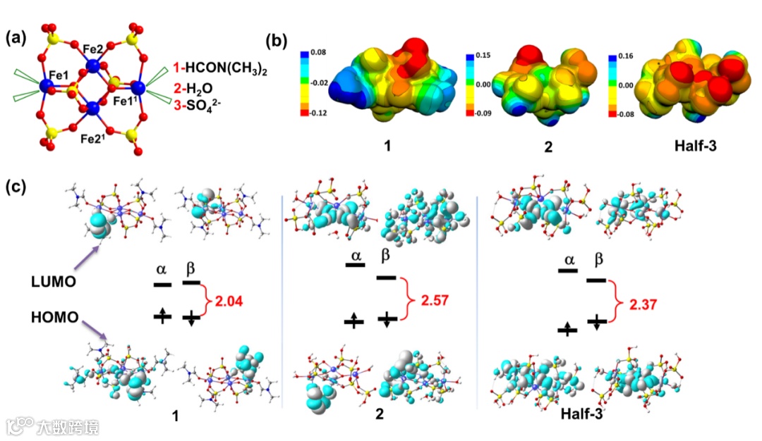 图2:(a) 三种簇合物中四个铁原子的不同配位模式 (b) 簇1、2和Half-3的分子静电势 (MEP) 分布的侧视图 (c) 簇1、2和Half-3的前沿轨道组成和能量。