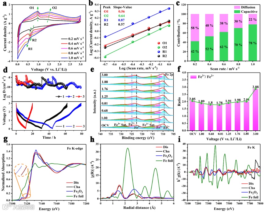 图4. 簇合物3 (a) 不同扫描速率下的CV曲线 (b) 不同扫描速率下,峰电流和扫速对数曲线 (c) 不同扫描速率下的扩散和双电层电容比例 (d) 第四圈放电/充电循环期间的GITT曲线和计算出的扩散系数 (e) 不同电压下Fe 2p的原位XPS光谱 (f) 不同电压下Fe3+/Fe2+的比例 (g) Fe K-边XANES (h) 傅里叶变换EXAFS (FT-EXAFS) (i) Fe K-边扩展X射线吸收精细结构(EXAFS)振荡函数.