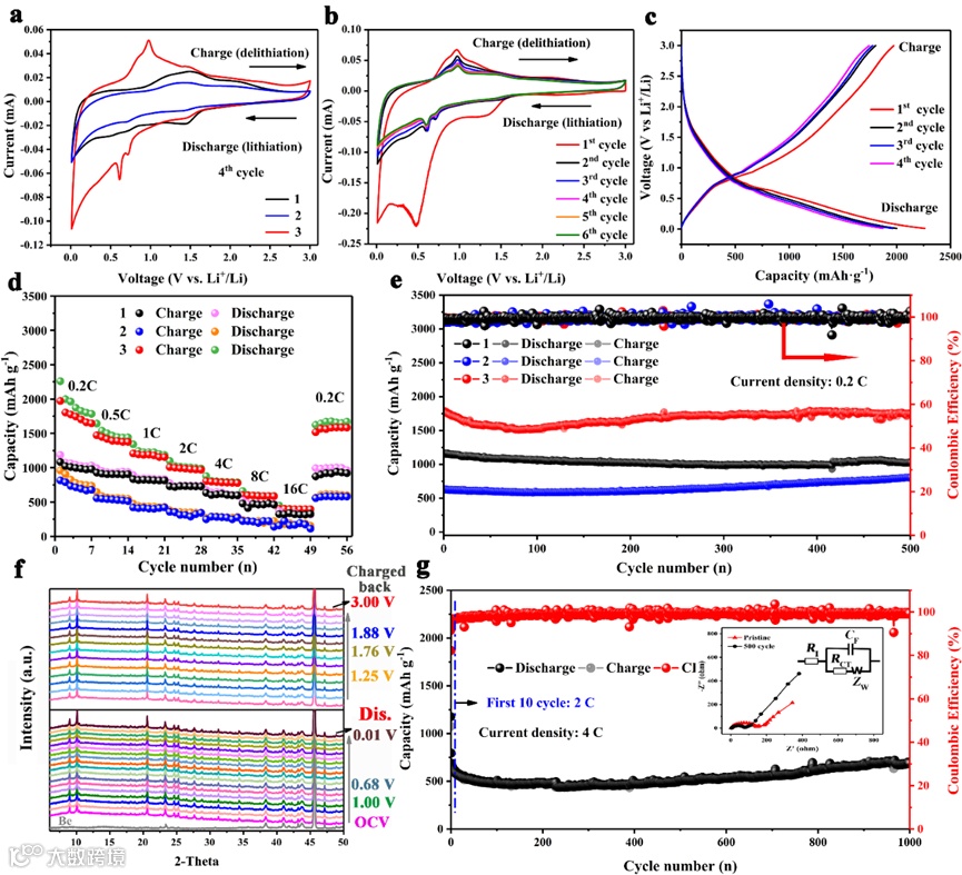 图3. (a) 0.2 mVs-1下,三种铁氧簇合物作为锂离子电池阳极材料的CV对比图。(b) 簇合物3:0.01-3.0 V (vs. Li+/Li) 下的 CV曲线 (c) 簇合物3:充放电曲线 (d) 在不同电流密度下的循环测试 (e) 簇合物3:在0.2C下进行的循环稳定性测试 (f) 放电-充电过程中,以簇合物3作为电极进行的原位XRD测试 (g) 簇合物3在4C下进行循环稳定性测试。插图:簇合物3的电化学阻抗谱图和等效拟合电路。