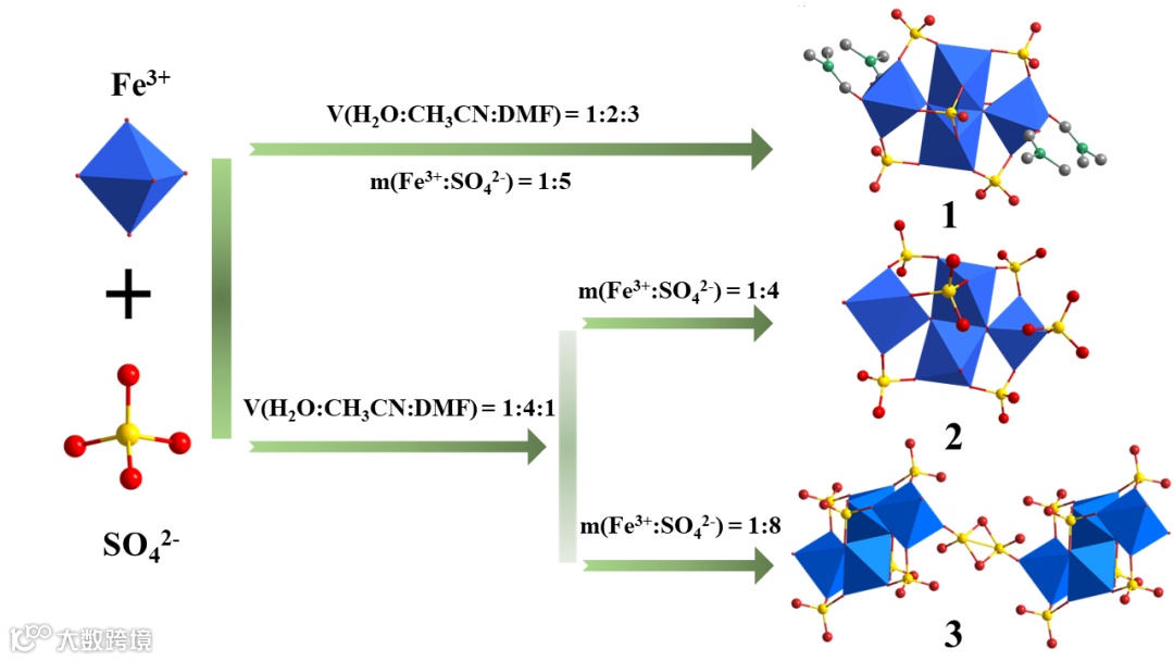要点一:通过溶剂热反应,调控溶剂、Fe3+和SO42-的比例,合成三种不同配位模式的铁氧簇合物。当Fe3+和SO42-的质量比达到1:8,获得具有一维孔道结构的无机铁簇合物3.