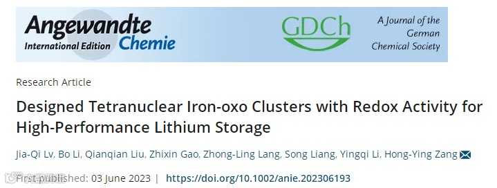 Jia-Qi Lv, Bo Li, Qianqian Liu, Zhixin Gao, Zhong-Ling Lang*, Song Liang, Yingqi Li*, Hong-Ying Zang*, Designed Tetranuclear Iron-oxo Clusters with Redox Activity for High-Performance Lithium Storage. Angew. Chem. Int. Ed. 2023, DOI: 10.1002/anie.202306193.
