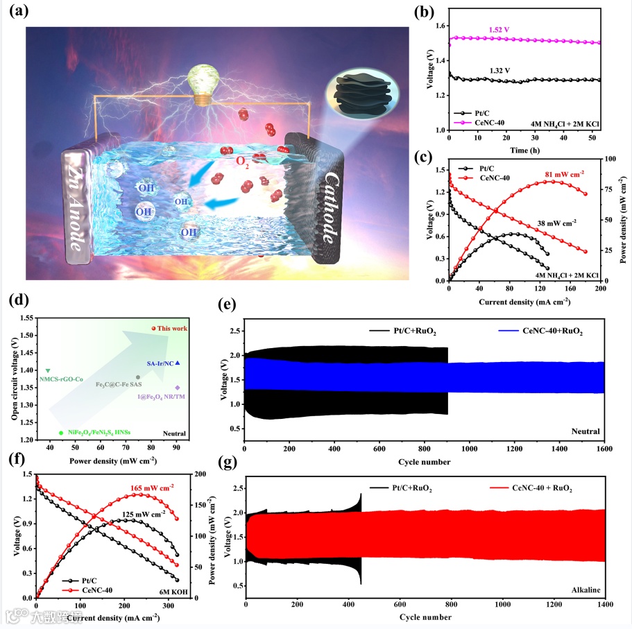 图6 a)自呼吸式锌空气电池示意图。b) OCV图,c)基于Pt/C和CeNC-40的中性ZABs的放电图和功率密度。d)基于CeNC-40的中性ZAB与一些具有代表性的中性ZABs的性能比较。e)基于CeNC-40的中性ZAB在2 mA cm−2下的循环稳定性。f)放电图和功率密度,g) CeNC-40基ZAB在碱性电解质中在5 mA cm−2下的循环稳定性。
