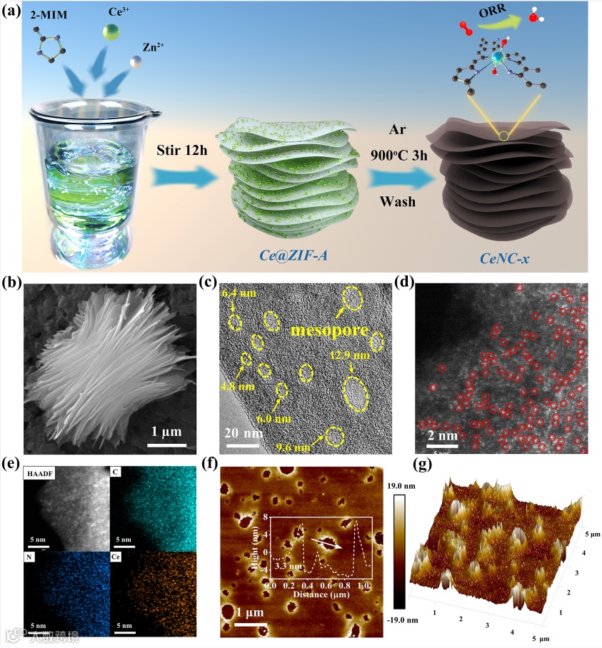 图2 a)CeNCs的合成示意图。b) SEM图像,c) TEM图像,d) HAADF-STEM图像,e) EDS元素映射,以及f,g)CeNC-40的AFM拓扑图。