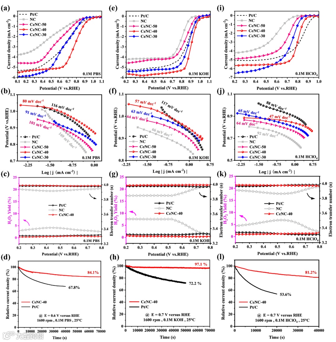 Ce独特的配位结构和局部电子构型显著提高了CeNCs的ORR性能,特别是在极低的H+和OH-浓度下。CeNC-40在中性条件下显示出较高的起始电位(1.03 V)和半波电位(0.78 V),高于商业铂碳催化剂(起始电位1.00 V和半波电位0.68 V)。CeNC-40具有较低的Tafel斜率同时证明具有较快的电子传输,增强ORR的本征活性。CeNC-40在70000s的恒电压测试下电流仅衰减15.9 %,并且在进行10000圈CV循环后其半波电位只衰减8mV,具有较强的稳定性。同时,CeNC-40在0.1 M KOH和0.1 M HClO4溶液中分别具有0.90 V和0.80 V的优异半波电位以及良好的稳定性。以上数据展示CeNC-40在宽PH范围下拥有优异的电化学性能。