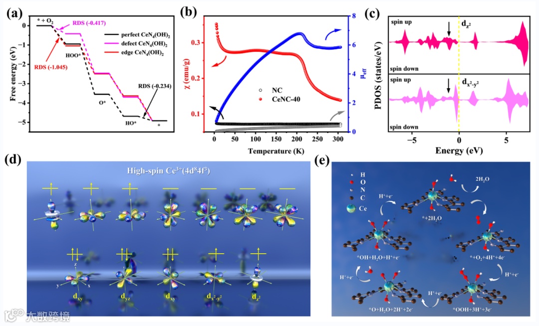 图5 a)U=0V的完美、缺陷和边缘模型的吉布斯自由能图,b)CeNC-40和NC的𝜒m和μeff图,c)dz2和dx2−y2边缘模型轨道,d)高自旋态Ce原子电子构型示意图,e)ORR催化机理示意图。