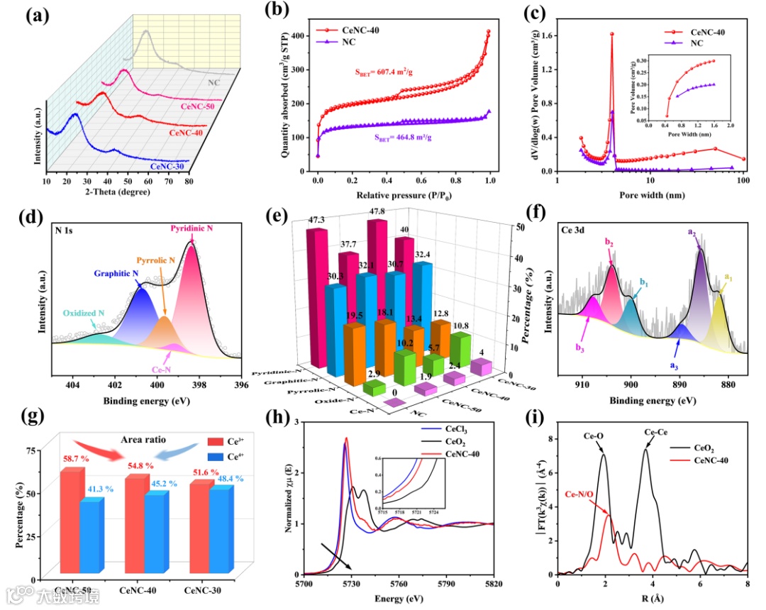 图3 a)CeNC和NC的XRD模式。b) N2吸附/解吸等温线和c)CeNC-40和NC的孔径分布。XPS d) N 1s和f)CeNC-40的Ce 3d光谱。e) N和g) Ce物种在CeNCs中的百分比。h)归一化的Ce-L3边XANES谱,以及i)CeNC-40的FTk3加权的Ce-L3边EXAFS谱和参考线。