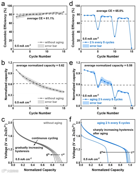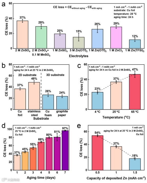 通过对不同参数的独立变化,研究发现在各种条件下(如电解液、基底结构、温度、时间、沉积容量等)锌电池在静置过程中均表现出显著的CE损失,该损失的幅度与之前测试的锂电池体系相比高出一个数量级。