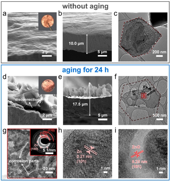 为了了解锌金属负极在静置过程中纳米尺度上的机制,该工作通过扫描电子显微镜观察到与Cu基底分离的残留非活性Zn,通过透射电子显微镜进一步证实这些非活性Zn为金属锌和锌的氧化物(例如,ZnO,Zn(OH)2,ZnSO4[Zn(OH)2]3∙xH2O)的复合物,同时观察到锌金属显著的形态变化,揭示了由于Zn表面缺少致密的固态电解质保护膜(SEI),局部腐蚀和空隙持续生成,加速了活性材料的流失。