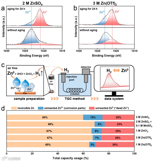X射线光电子能谱(XPS)能检测到Cu基底上不同强度的Zn0和Zn2+信号,存在静置过程的样品中,Zn0峰的强度远大于Zn2+,表明"死"锌的剩余量更大。为了高精度和准确地量化腐蚀损失(Zn2+)和"死"锌(Zn0)所导致的损失,研究进一步采用了滴定气相色谱法(TGC),定量地明确了静置过程中"死"锌是主要的CE损失来源,与此同时,腐蚀也在一定程度上对损失产生影响。