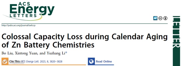 近日,来自加州大学洛杉矶分校(UCLA)的李煜章教授,在国际知名期刊ACS Energy Letters上发表了题为“Colossal capacity loss during calendar aging of Zn battery chemistries”的文章。该工作发现锌金属负极在仅仅24小时的静置过程中表现出12-37%的容量损失,这比之前研究过的任何其他电池化学体系的损失量都要大上一个数量级(图1)。通过利用透射电子显微镜和滴定气相色谱,该工作区分并量化了腐蚀损失(Zn2+)和失去电接触的"死"锌(Zn0)所导致的损失,揭示了"死"锌是锌电池静置过程中容量损失的主要因素并提供了可能的解决方案。
