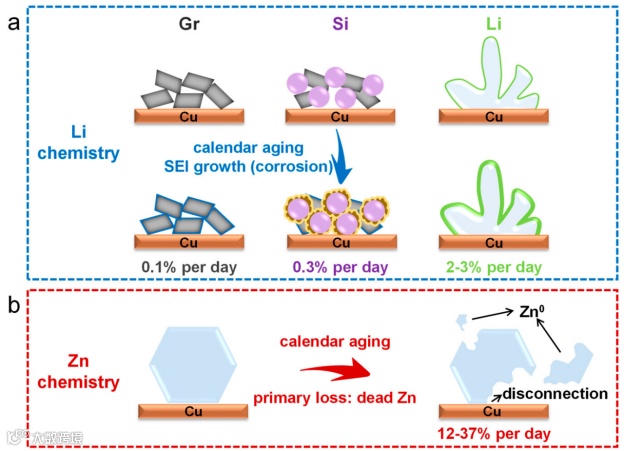 图1:锂电池和锌电池化学体系静置过程中的不同机制