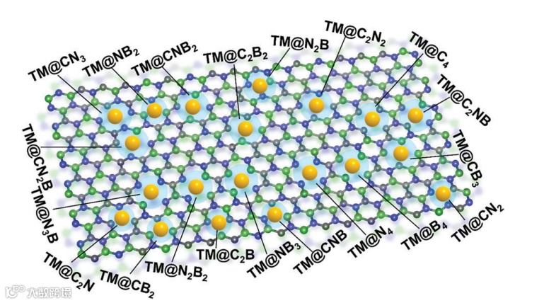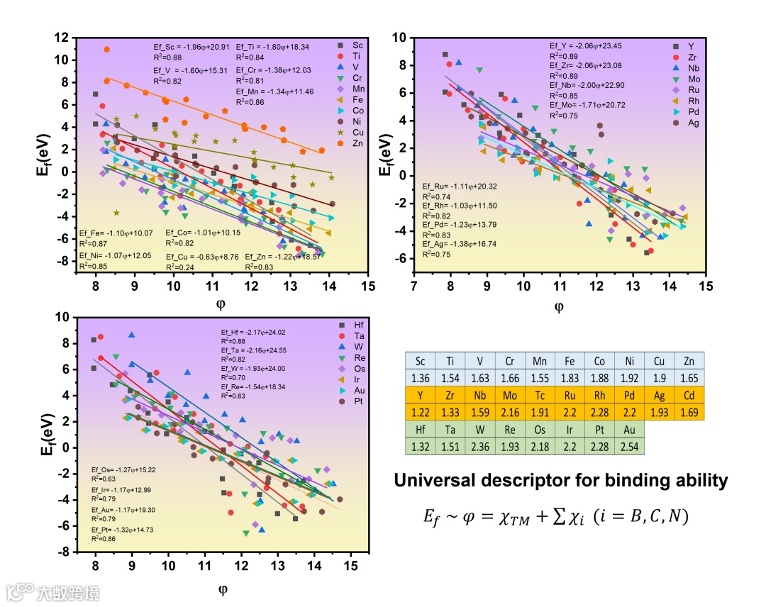 图1. 不同单原子在不同配位环境下结合能/形成能一般描述符,其中,Ef表示单个TM原子在BCN上的形成能,φ为描述因子,χTM表示TM原子的电负性,χi表示TM配位的B、C或N原子的电负性。