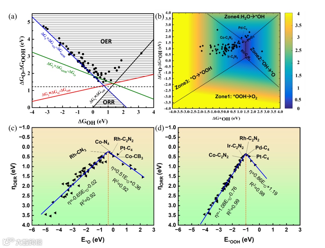图3. a)基于BCN的SAC的OER和ORR的火山图。(b)-(d)获得的催化活性火山图以及OER和ORR的描述符。
